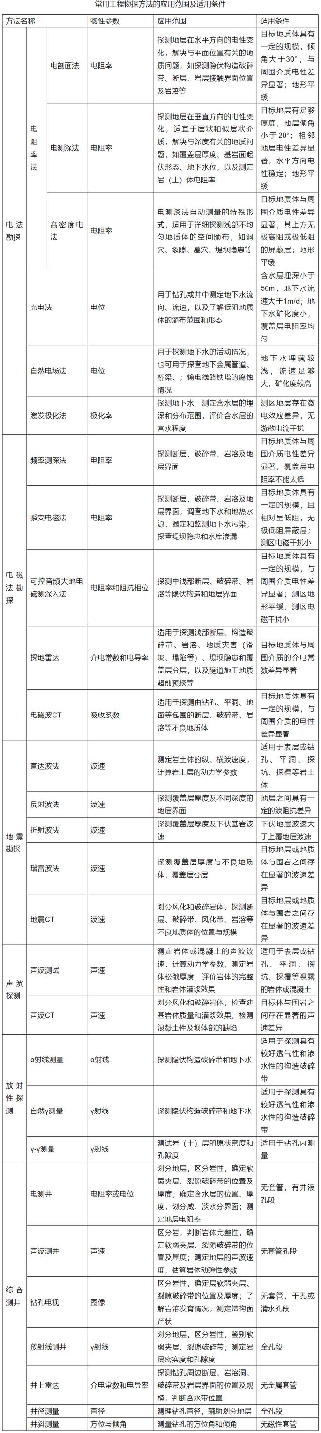 主要方法:电法(电阻率、探地雷达),地震波及声波测试(测井)、放射性测试